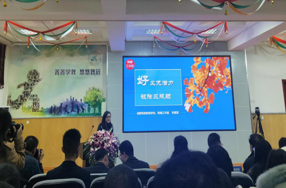 开幕式后,陈曦工作室快速成长的成都高新新城学校青年教师李素蓉老师带来《好风凭借力 破除三瓶颈》主题分享,她回顾了自己在陈曦名师工作室中的成长点滴,正是乘着工作室的好风,她找到了自己的前行方向,从一名普通老师成长为高新区语文学科带头人。