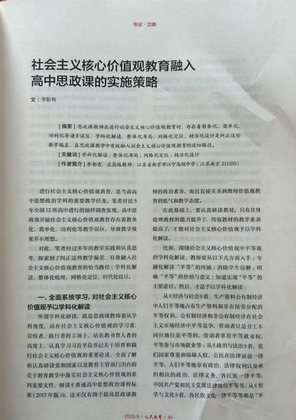 一是用基础教育教学成果奖去“摇动”。基础教育教学成果奖无疑是基础教育领域含金量最高的奖项,获得基础教育教学成果奖意味着教育成果获得省市乃至国家层面认可,具有业内权威影响力,获奖成果会获得教育主管部门的大力推 广。教学成果奖之后才是市级教学能力比赛奖和优质课,才是论著论文和成果转载,这足以说明,市级以上教学成果奖,其含金量都高于市教学能力比赛和优质课奖,都高于论著和论文。本人对2012年承担的江宁区教科规划课题、2015年主持的江苏省教育科学“十二五”规划重点课题、2017年负责的南京市基础教育前瞻性教学改革实验项目的实 践研究成果梳理、提炼、总结后,申报的《社会主义核心价值观教育融入政治课教学的实践探索(2012——2024)》,5月被认定为南京市基础教育优秀教学成果,是本届高中段唯一获此殊荣的奖项。这不仅是对本人深耕课堂育人、锐意创新的高度褒奖,更是对本人13年核心价值观教育教学探索的肯定。这份荣誉既是过往努力的勋章,更是未来奋进的号角。成果提出的价值观教育策略,因获奖必将被更多老师借鉴。
