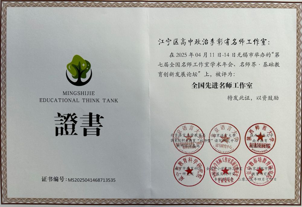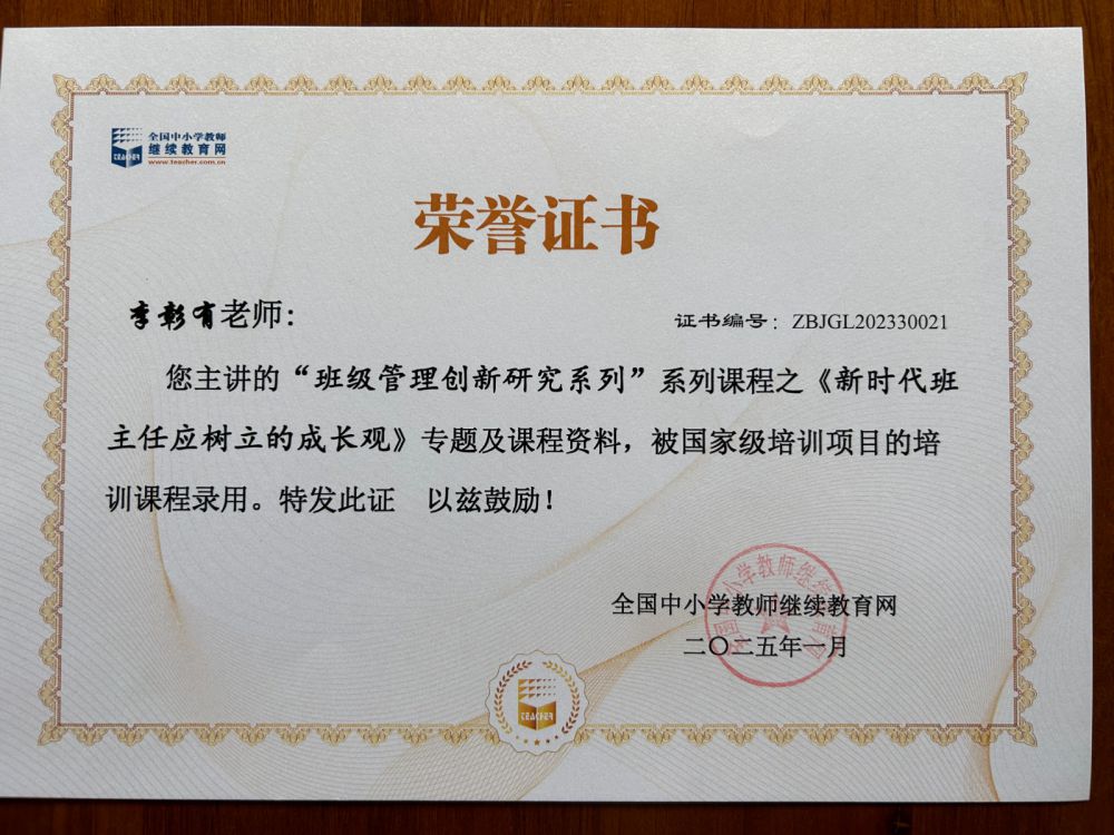 另外,通过参评去“摇动”。《奏响“七子”之歌 提升培养实效》在第七届名师工作室学术年会上获得全国名师工作室建设成果一等奖。论文《用教育理念抒写成长的精彩》在“教学月刊·2025年中学学科教研与教师发展论文大赛”中被评为三等奖。
