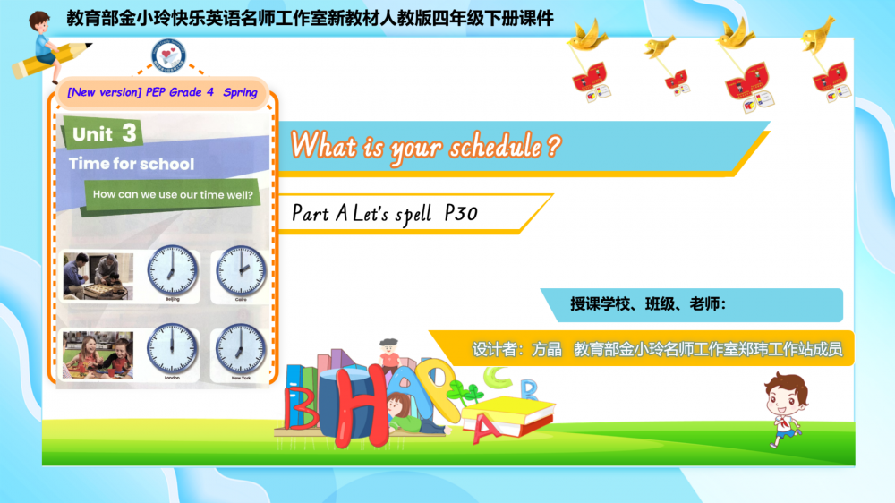 本套课件秉承教育部金小玲名师工作室“快乐英语”理念,紧扣新课标核心素养要求,结合四年级学生认知特点,构建“情境—任务—快乐”三位一体的教学路径。