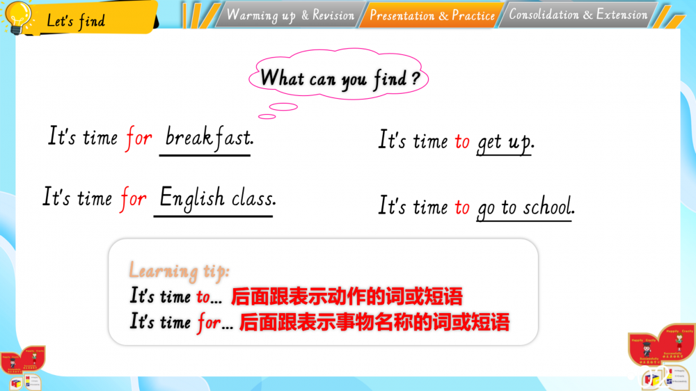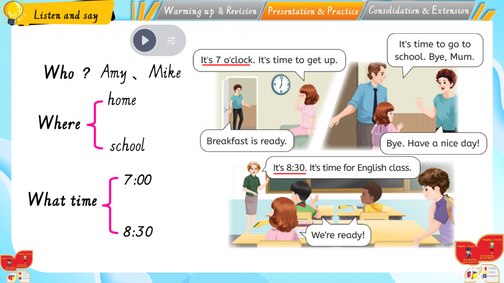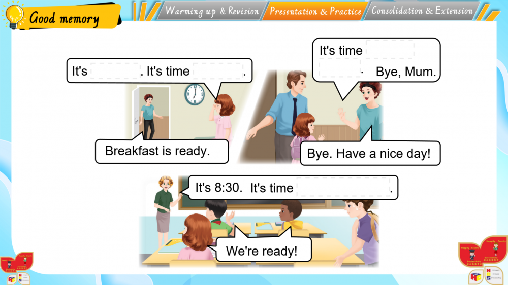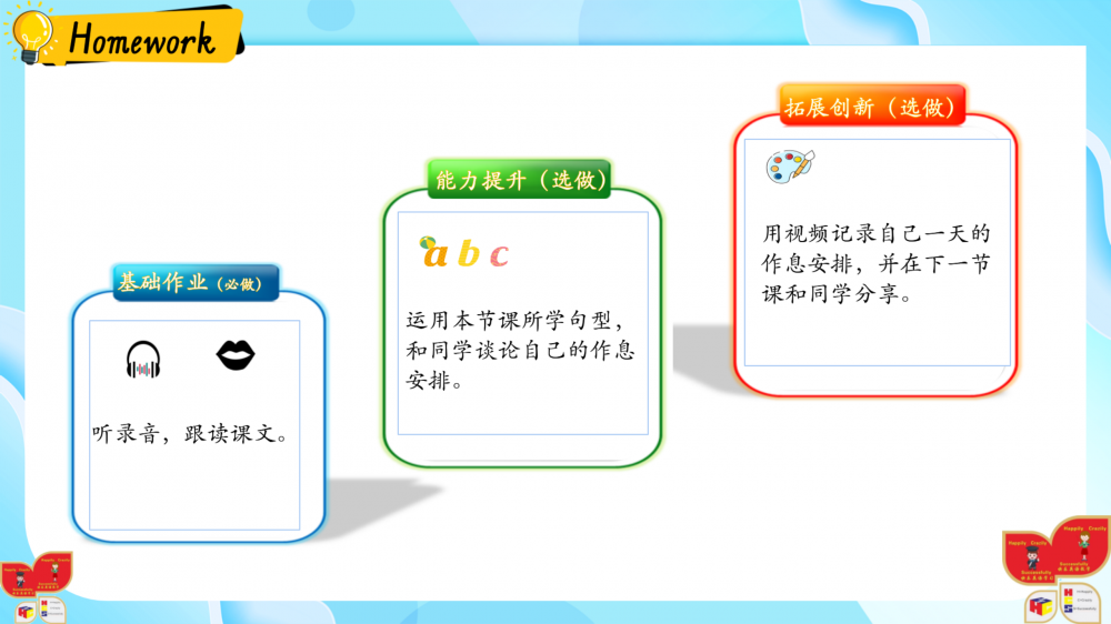 1. 以情境为基,通过动画、互动游戏还原生活场景(如家务劳动等),落实新课标“真实语境中学习语言”的要求;
