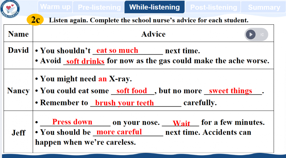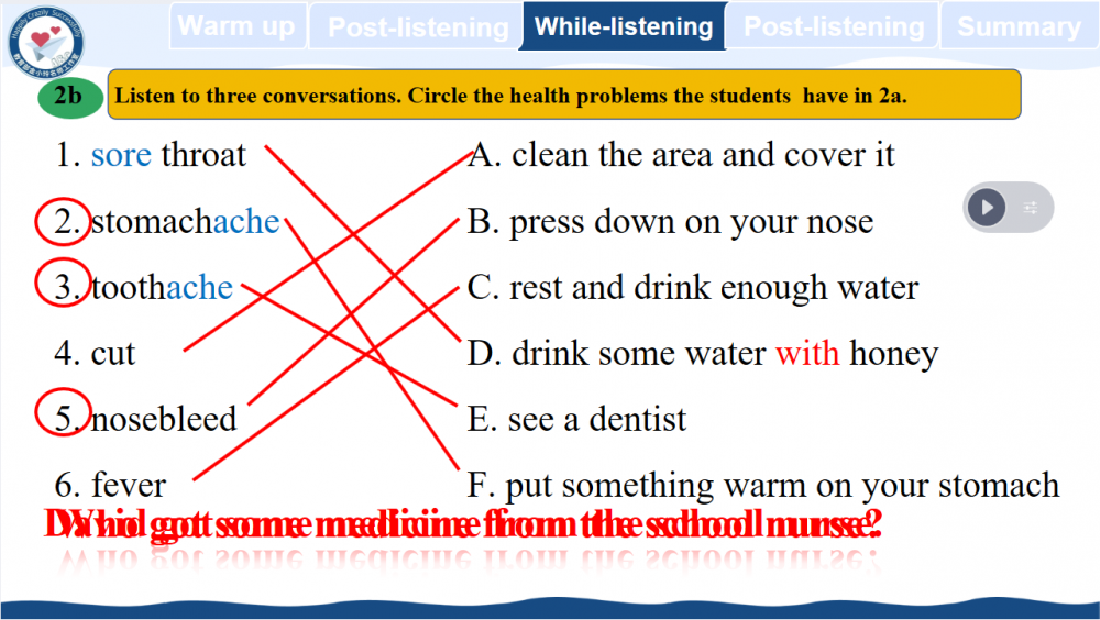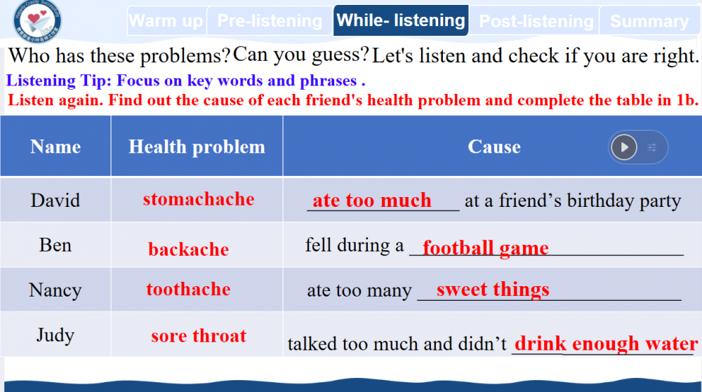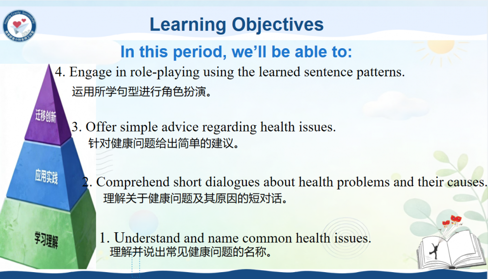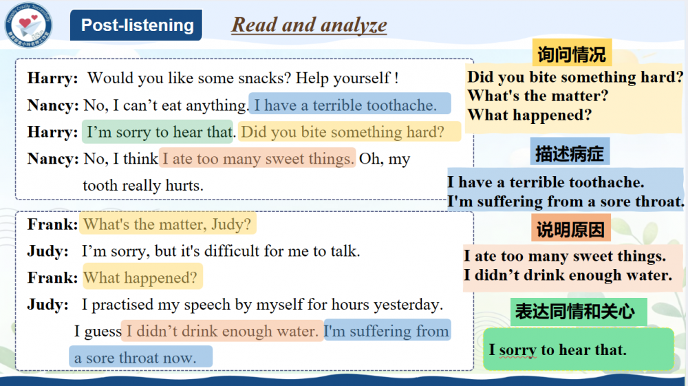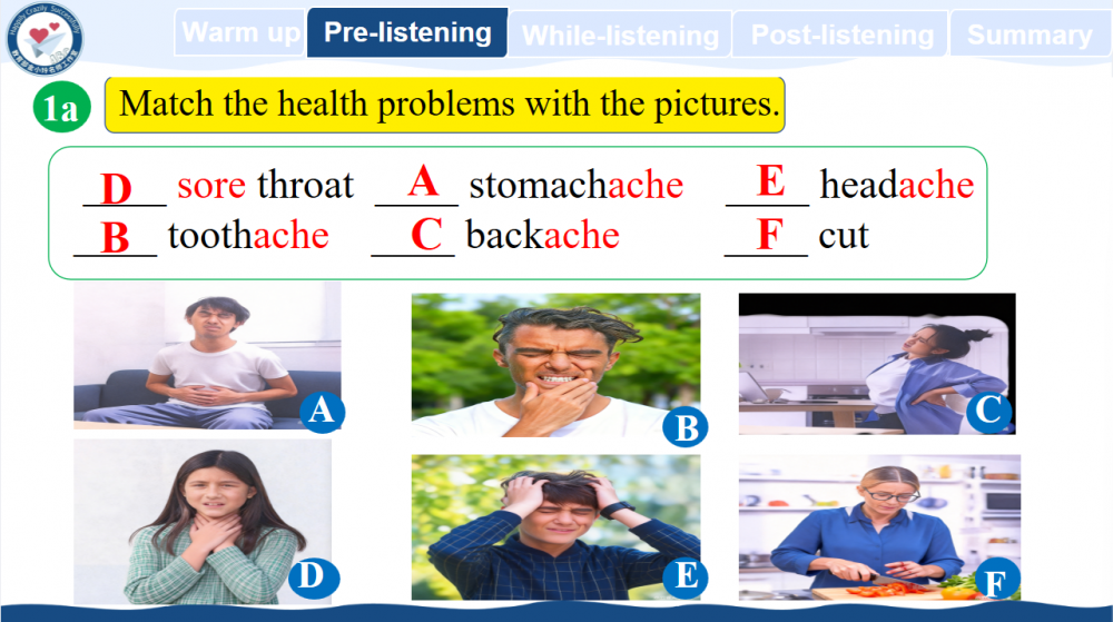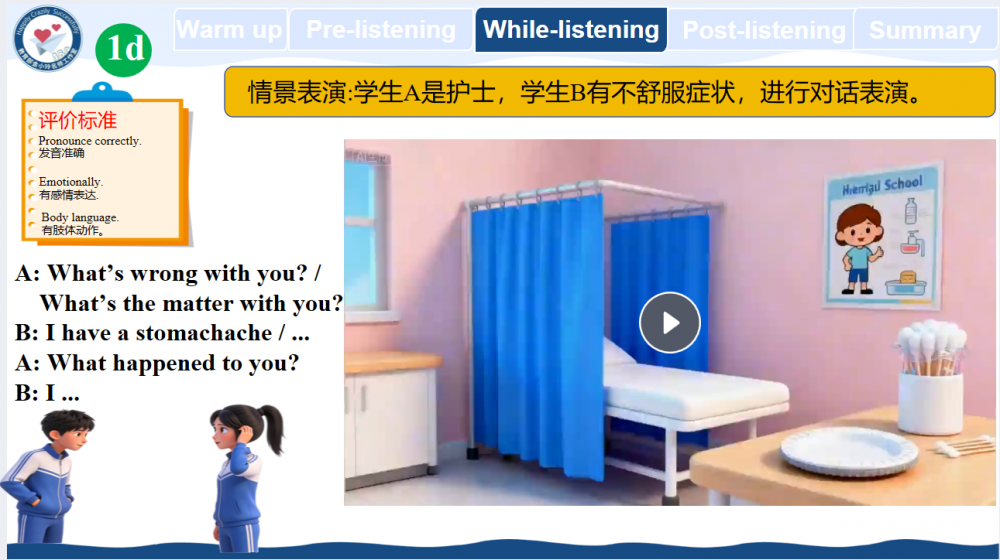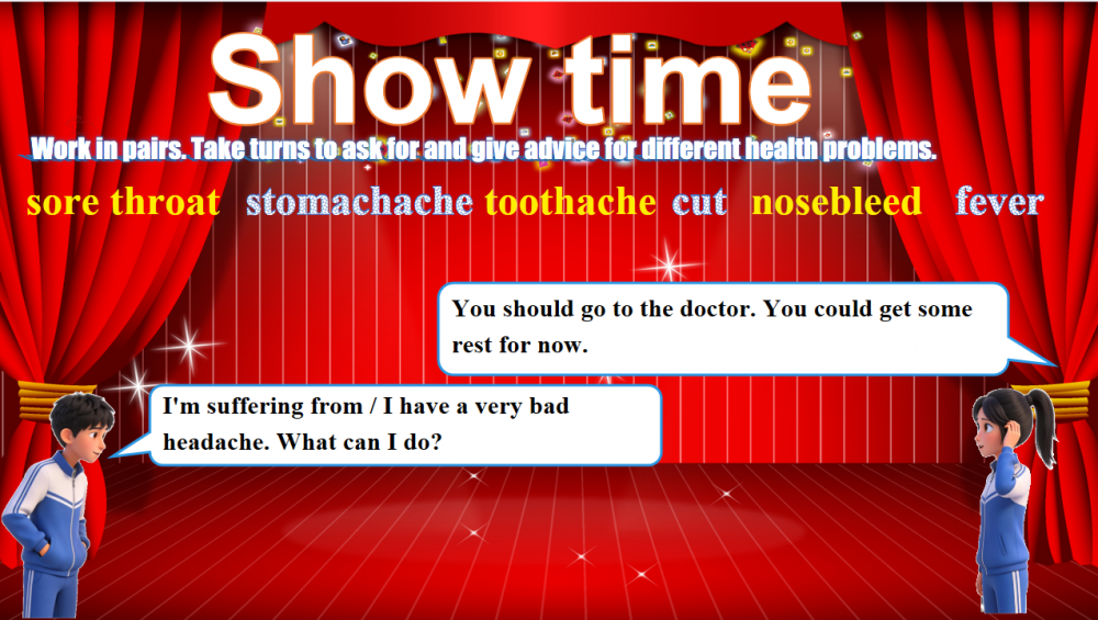 2. 情境化交际设计底部核心句型以对话模板(A: What’s wrong with you? B: I have a stomachache... A: You should go to the doctor...)呈现,模拟 “关心他人健康 — 询问病情 — 给出建议” 的真实生活场景,让学生在语境中感知语言功能,避免机械记忆,符合 “情境教学” 的要求。